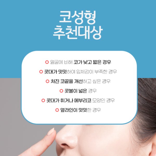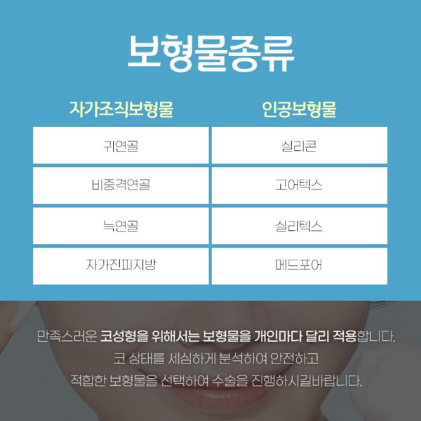부작용을 최소화하고 만족도를 극대화하기 위해 코 모양과 피부 특성에 맞춰 개별 삽입물을 신중하게 선택합니다. 필요시에는 인공 보형물과 자가 조직을 함께 활용하는 복합적인 접근을 통해 인공적인 느낌은 줄이고 자연스러움은 더하는 방식도 있습니다.